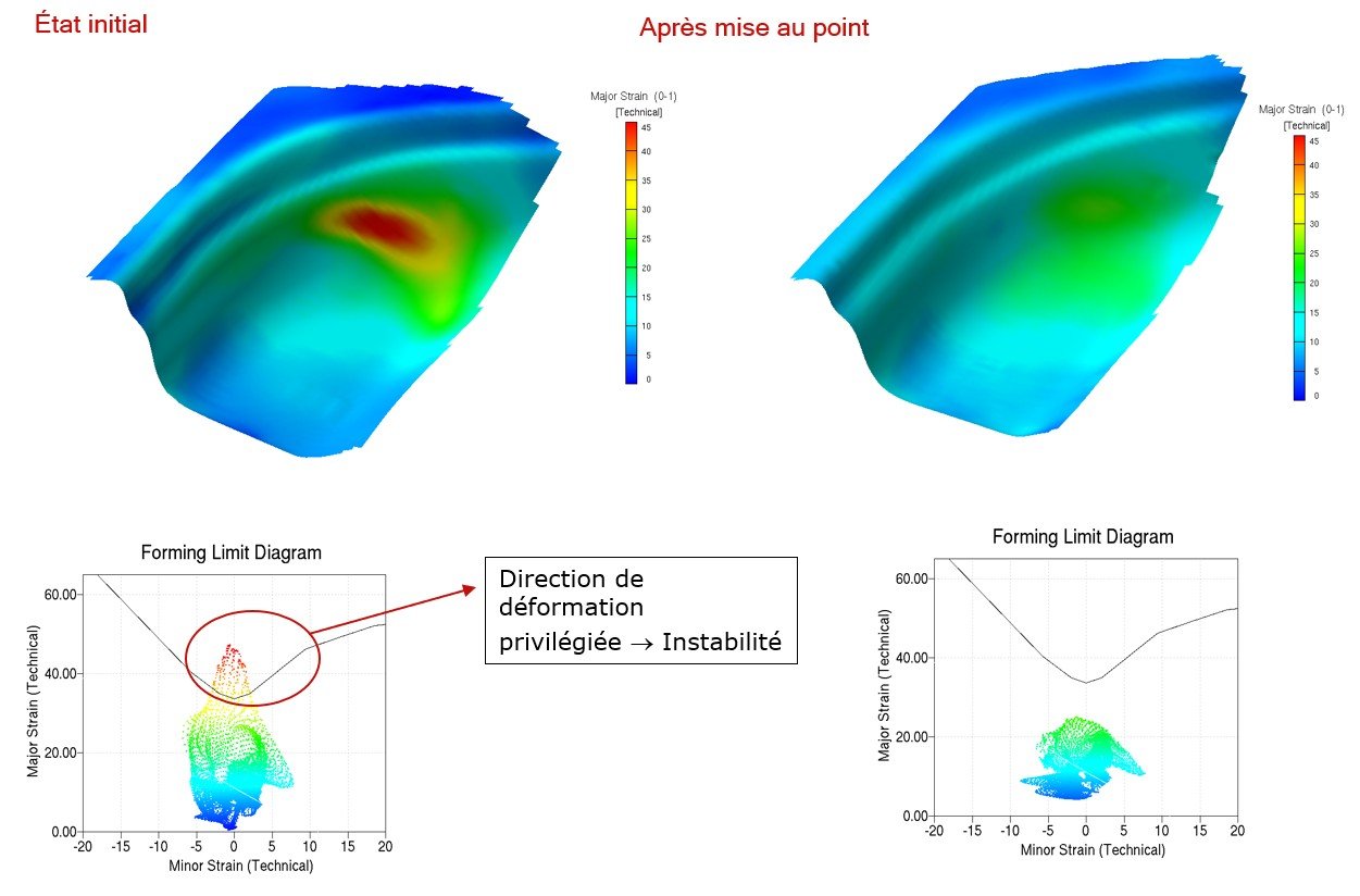 Analyse des résultats : La cartographie de l’amincissement présente les points chauds, qui, et ce n’est pas une surprise, correspondent à la zone de fissuration. Mais l’information la plus riche a été tirée du tracé du Diagramme de Formage (FLD) qui présente tous les points de mesure selon (E1,E2) et les positionnent par rapport à la Courbe Limite de Formage (CLF) du matériaux. Ce nuage de point présentait un pic significatif en étant aussi très étiré verticalement, ce qui signifie une direction de déformation majoritaire. En superposant la direction de la déformation principale sur la cartographie 3D des déformations, nous avons constaté une orientation massive du flux matière dans une direction. Tous les signes convergeaient vers une instabilité due à une mauvaise circulation de la matière lors de la mise en forme. Une moins bonne lubrification, une épaisseur un peu plus faible, ou toute autre mini variation du process était amplifiée par cette instabilité et finissait pas une casse.